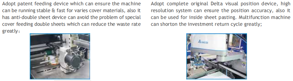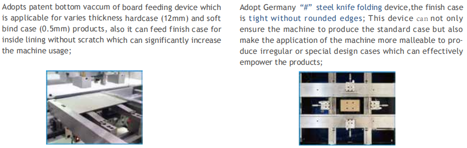 It adopts patent paper feeding system which can be applicable for more variety of cover materials and special small size, high resolution robotic arm can ensure the position fast and stable; “#” type folding principle not only can wrap common cases compact and elegant, but also allows the machine to make more different special design cases which canincrease the added value of the cases and production efficiency of the special cases.
